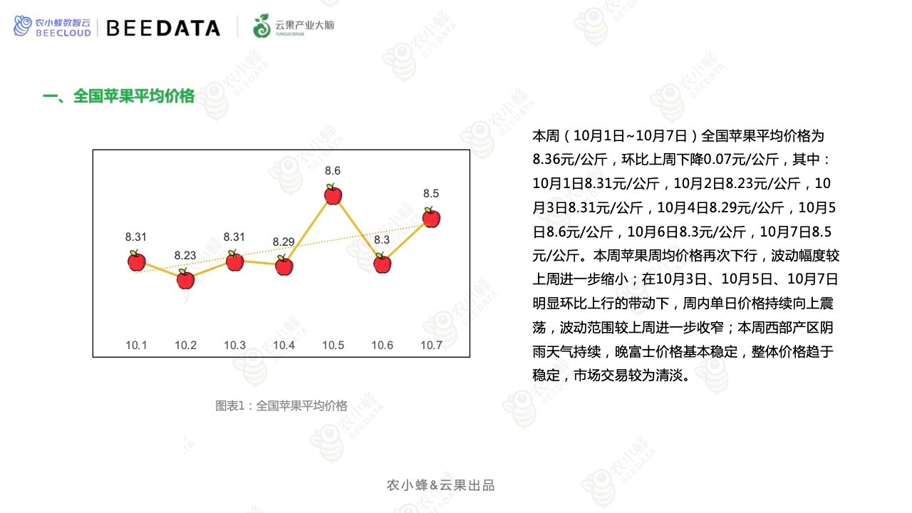 本周(10月1日~10月7日)全国苹果平均价格为8.36元/公斤,环比上周下降0.07元/公斤,本周苹果周均价格再次下行,波动幅度较上周进一步缩小;