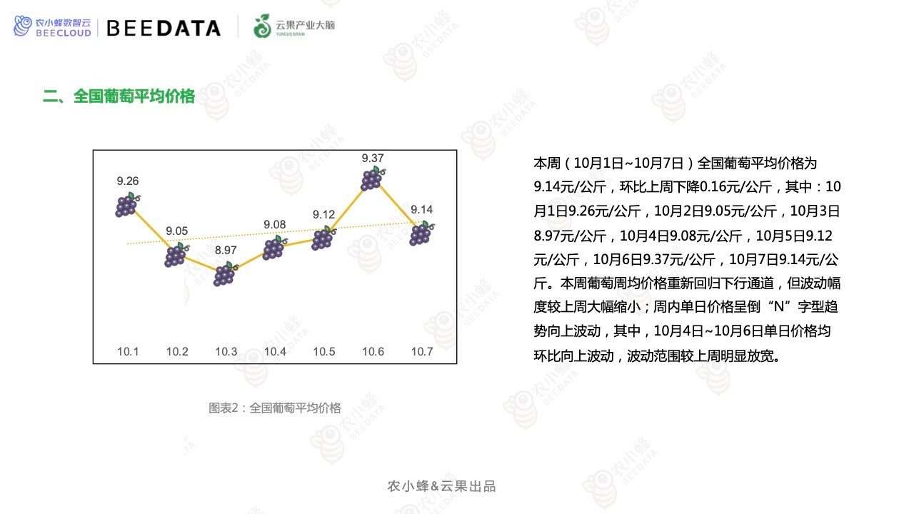 本周(10月1日~10月7日)全国葡萄平均价格为9.14元/公斤,环比上周下降0.16元/公斤,本周葡萄周均价格重新回归下行通道,但波动幅度较上周大幅缩小;