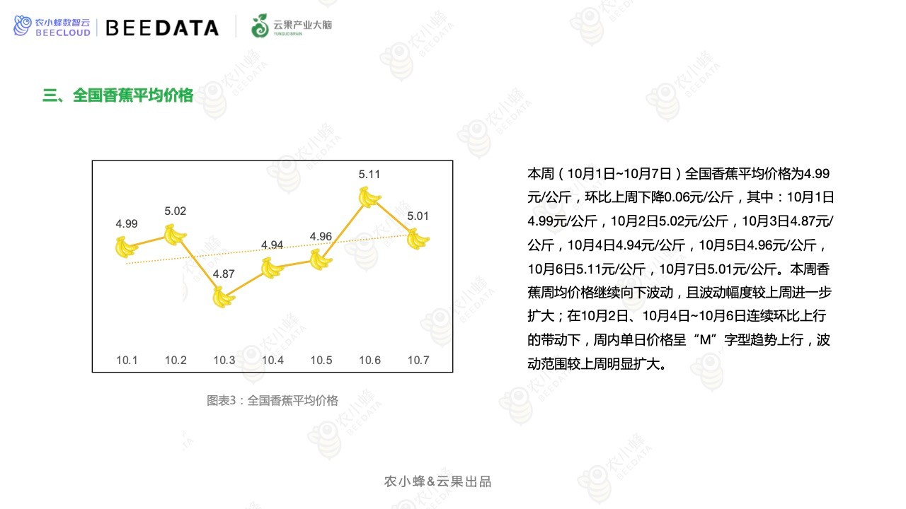 本周(10月1日~10月7日)全国香蕉平均价格为4.99元/公斤,环比上周下降0.06元/公斤,本周香蕉周均价格继续向下波动,且波动幅度较上周进一步扩大;