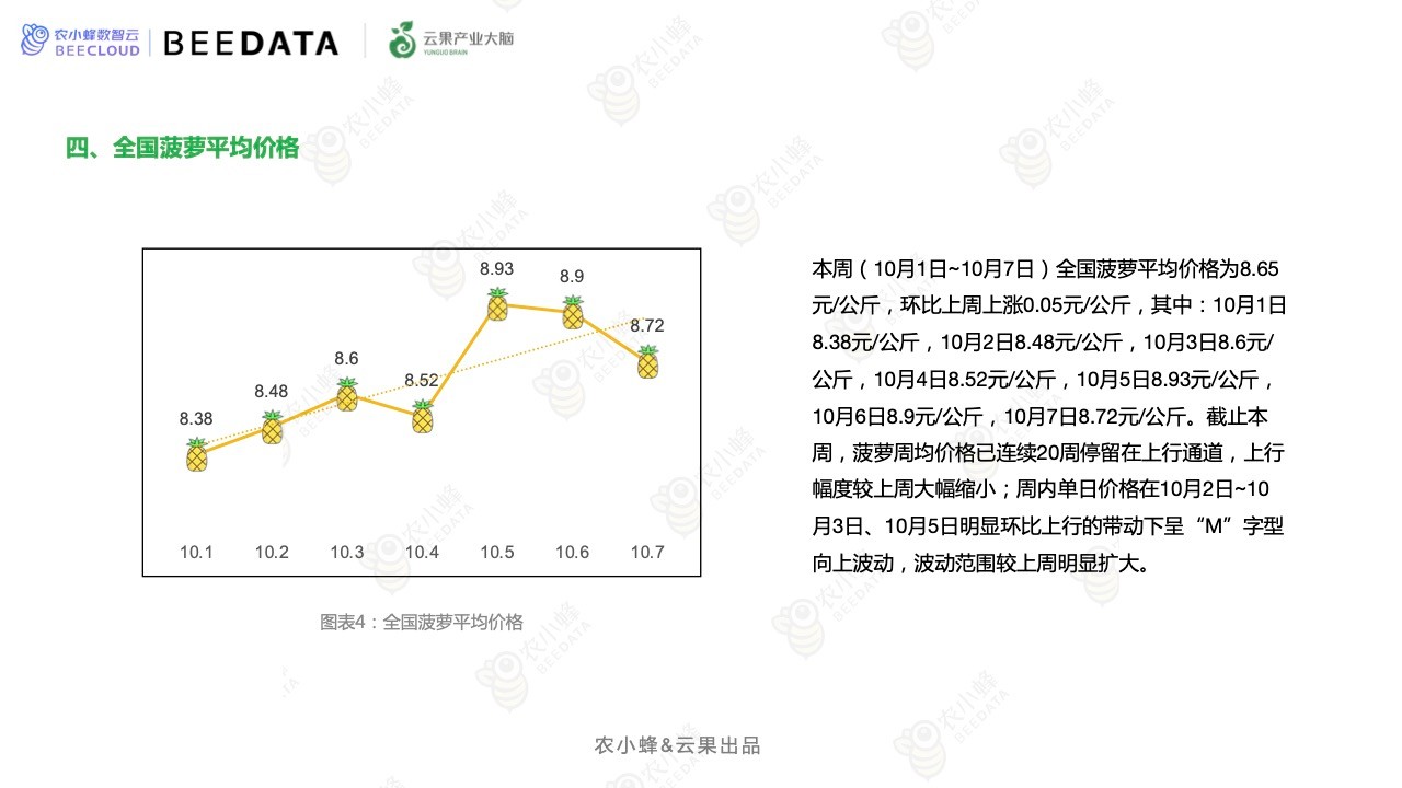 本周(10月1日~10月7日)全国菠萝平均价格为8.65元/公斤,环比上周上涨0.05元/公斤,本周菠萝周均价格已连续20周停留在上行通道,上行幅度较上周大幅缩小;