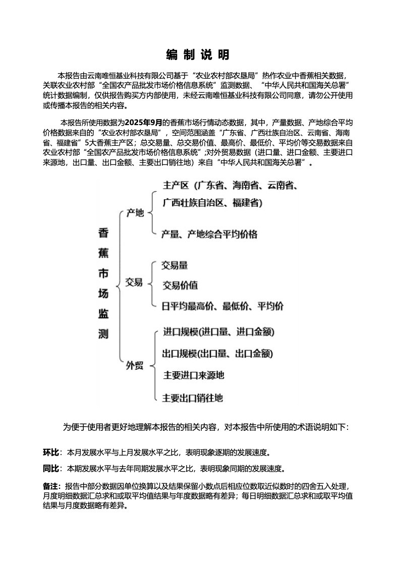 2025年9月,全国香蕉主产区产地综合平均价格为2.4元/公斤,与上月相比,下降了4%;与去年同期相比,下降了28.8%。从历史数据来看,2024年12月~2025年9月,全国香蕉主产区产地综合平均价格从2.9元/公斤波动至2.4元/公斤;每月对应的上涨/下降幅度也从5.6%变化至-4.0%;近一年峰值为2025年5月的3.6元/公斤,谷值为2025年7月、2025年9月的2.4元/公斤。