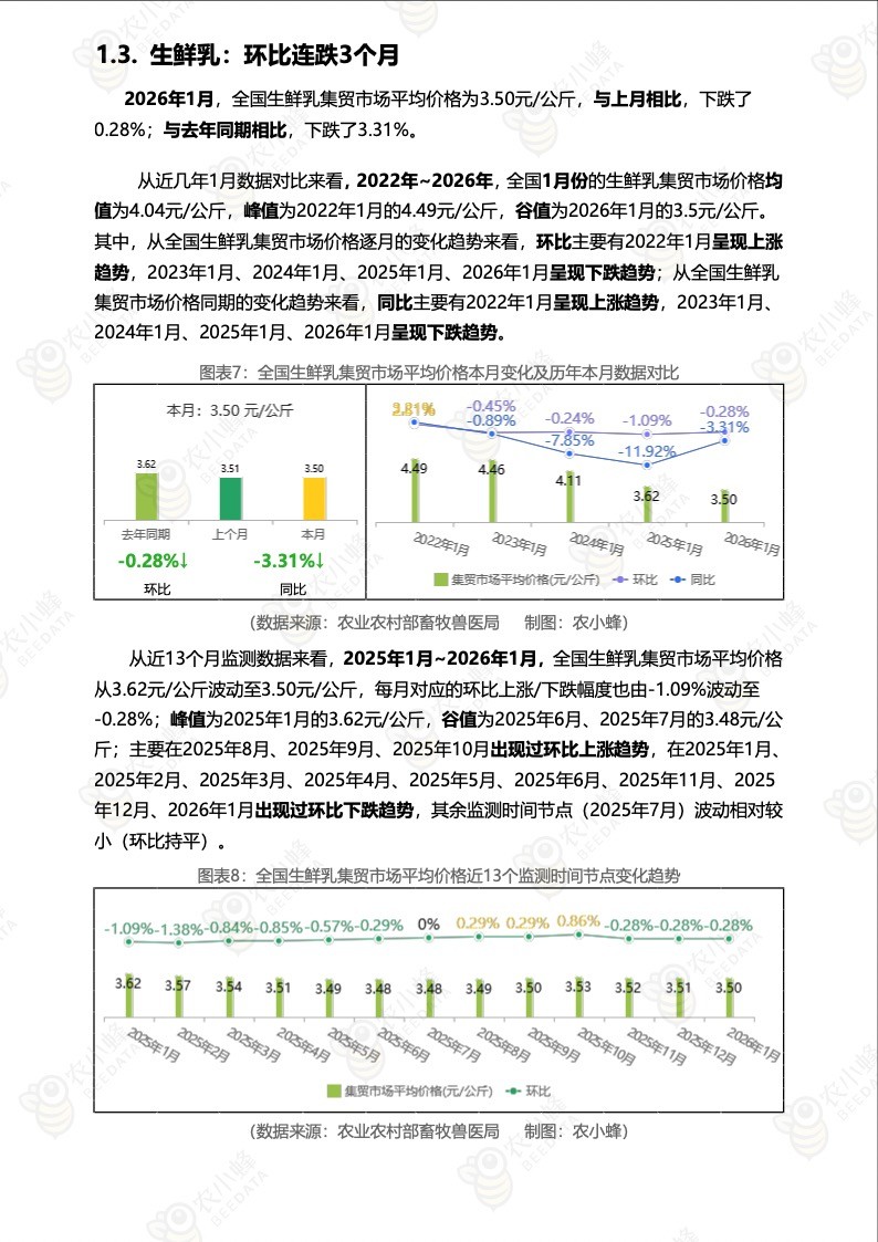 2026年1月,全国生鲜乳集贸市场平均价格为3.50元/公斤,与上月相比,下跌了0.28%;与去年同期相比,下跌了3.31%。