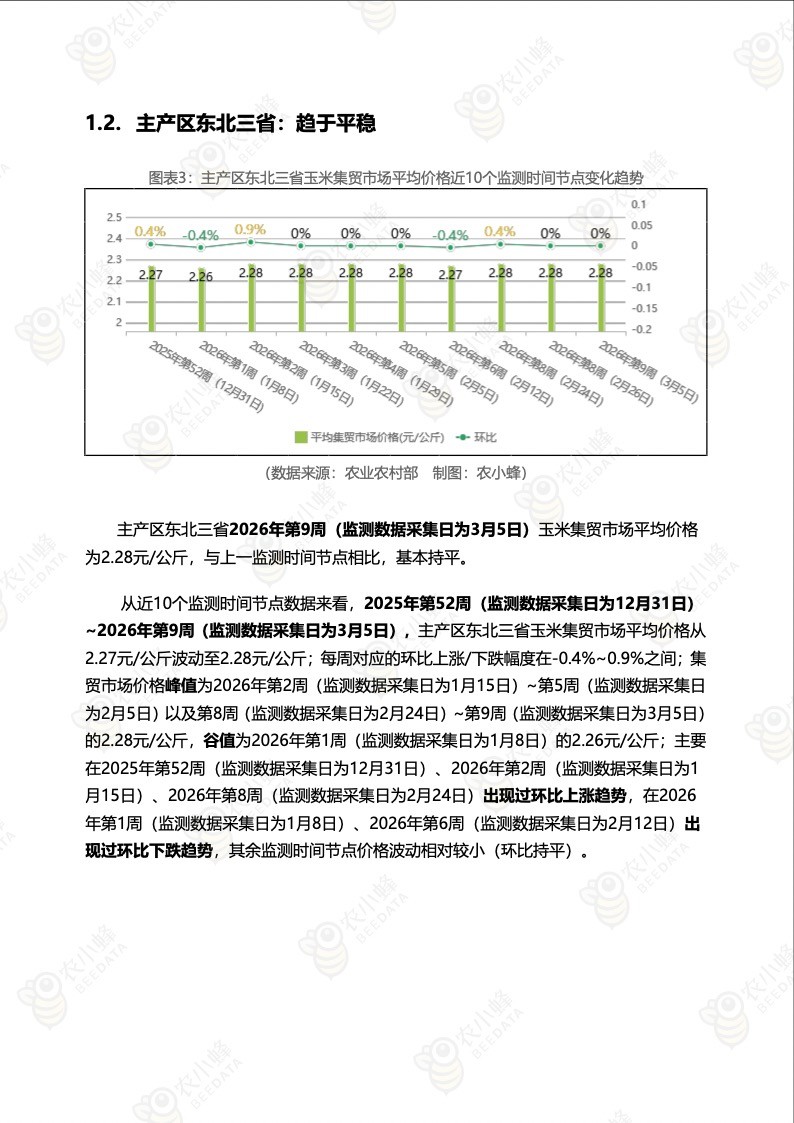 主产区东北三省2026年第9周(监测数据采集日为3月5日)玉米集贸市场平均价格为2.28元/公斤,与上一监测时间节点相比,基本持平。